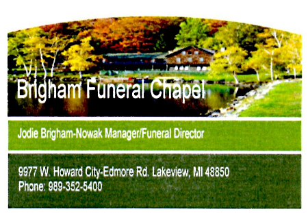 Funeral services for Ruth will be at 2:00 PM on Sunday, October 21, 2018 at Brigham Funeral Chapel, Lakeview. The family will greet friends at 1:00 PM until time of service. All are invited to a luncheon in the Brigham Funeral Chapel Banquet Room following the interment at Cato Twp Cemetery. Contributions in Ruth’s memory may be made to St. Jude Children’s Hospital. Condolences may be made utilizing the guestbook at www.brighamfuneralchapel.com.